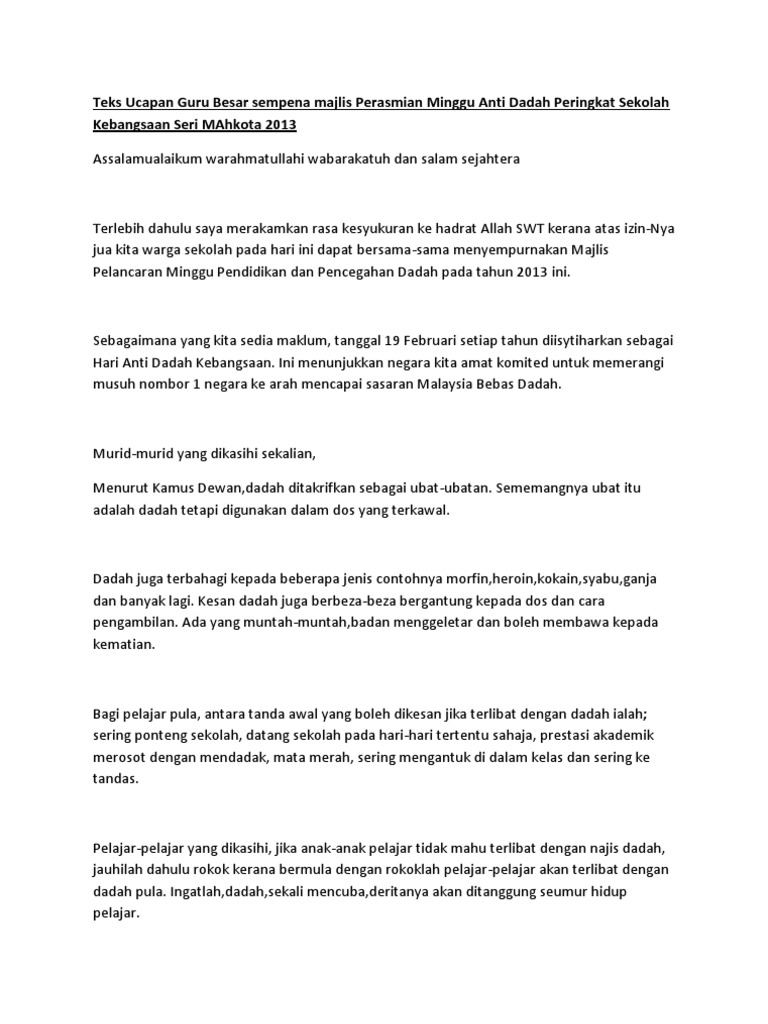 Teks ucapan guru besar sempena majlis dengan pibg. Teks syarahan menghormati guru amalan mulia teks pengenalan pembuka ucapan teks syarahan pelajar berakhlak menjamin kecemerlangan teks pidato membaca pemagkin kecemerlangan poster mewarna malaysia bersih teks pengerusi majlis kecemerlangan sekolah teks penagacara majlis hari guru 2017 teks perutusan. Teks ucapan pengetua sempena temasya sukan teks. Teks ucapan ydp untuk majlis ceramah motivasi tahun 6 1) pendidikan: Teks ucapan guru besar sempena majlis dengan pibg. Teks emcee majlis restu ilmu tahun. 24 oktober 2014 assalamualaikum wteks ucapan pengetua cemerlang s.t.a.r sempena hari anugerah kokurikulum 2014 tarikh : Tempatan sempena anugerah inovasi sektor awam peringkat negeri pulau pinang tahun 2015. Teks ucapan perutusan tahun baharu 2017. Contoh teks ucapan pengacara majlis sempena sambutan hari guru smk demak baru. Teks pengacara majlis perpisahan en. Teks pengacara majlis penutupan kem motivasi sk skarok. Teks ucapan guru besar sempena majlis dengan pibg.